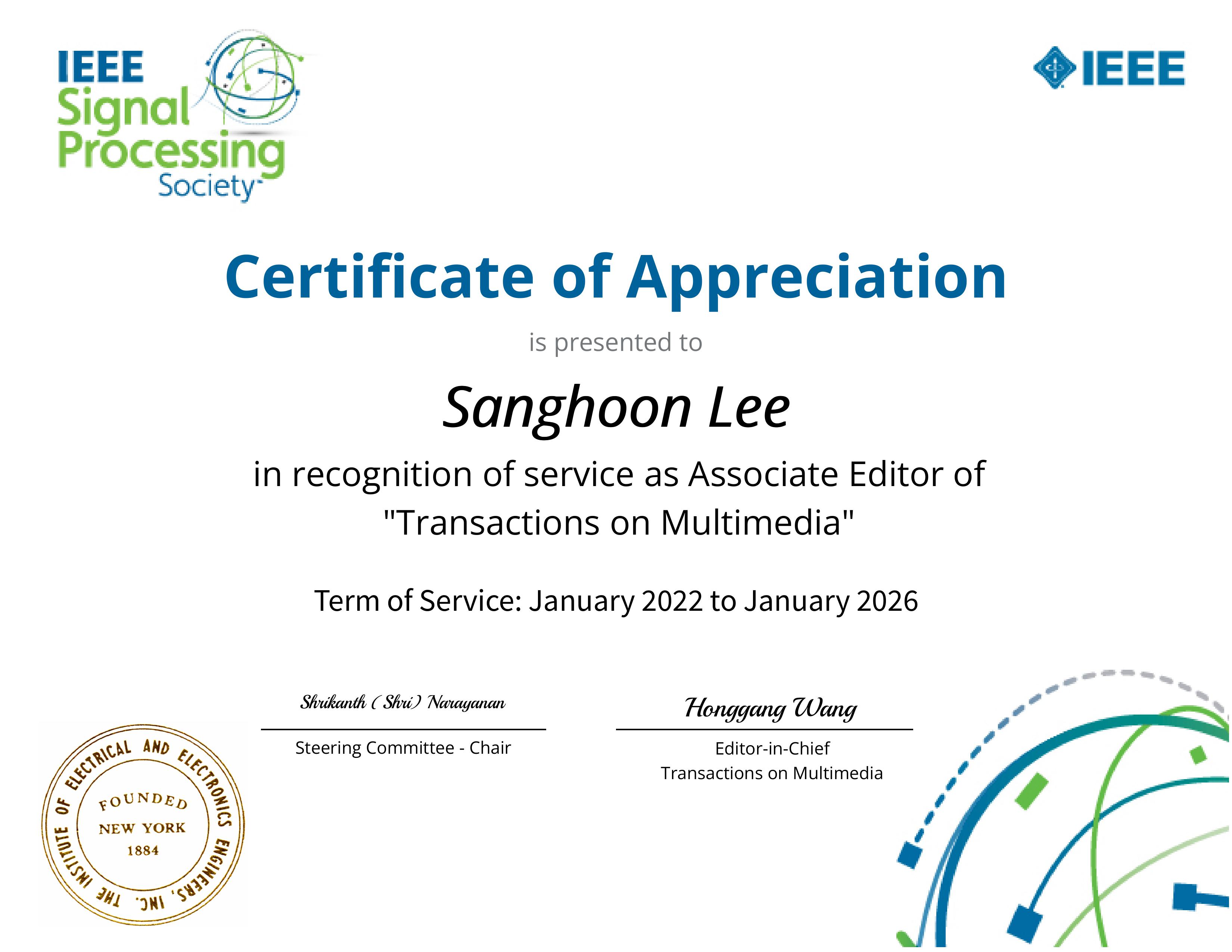 - Certificate of Appreciation, Prof. Sanghoon Lee, IEEE TMM 2011-02-09